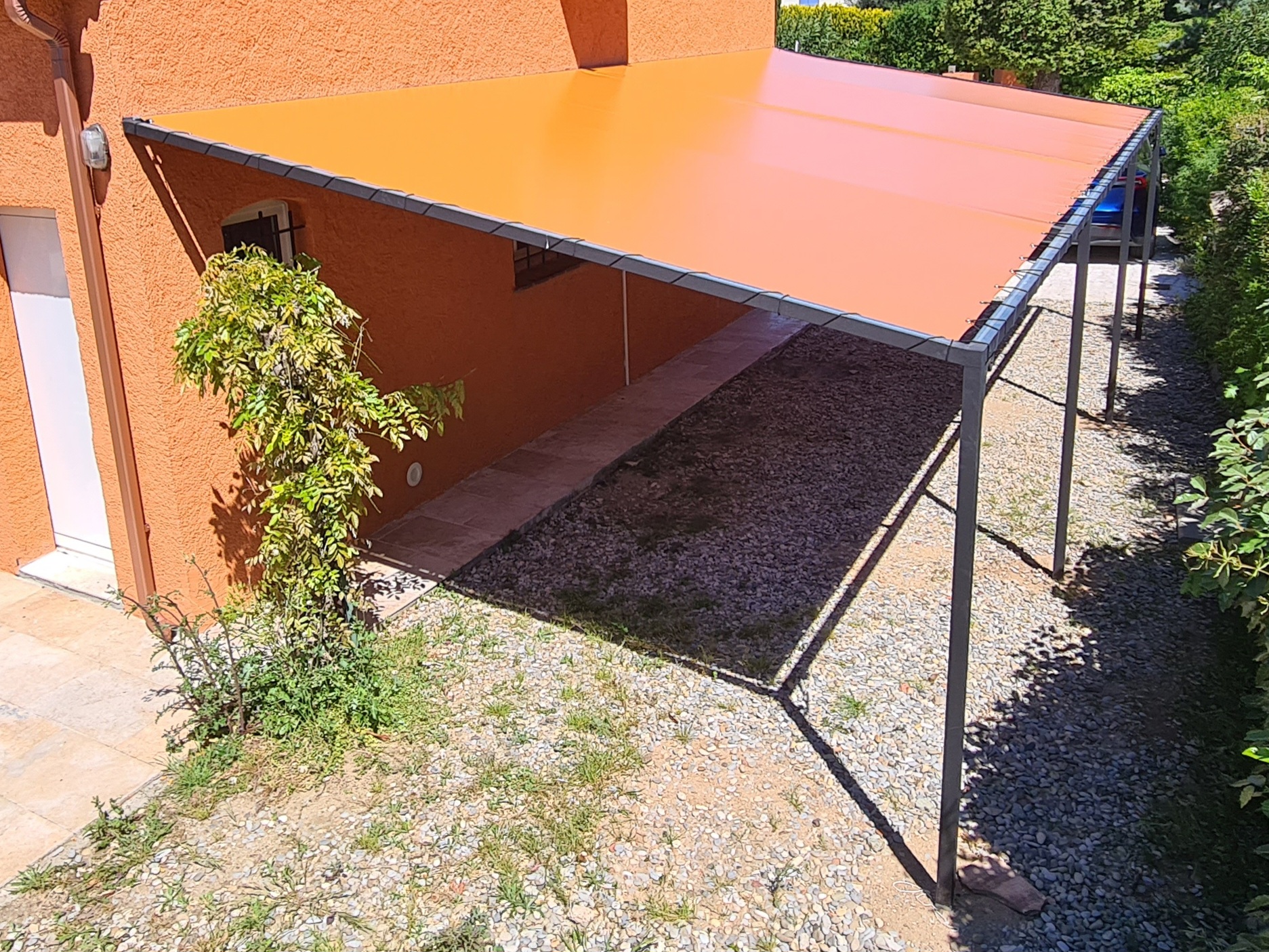 vec ce carport acier et toile étanche, le client bénéficie d’un abri voiture parfaitement adapté au climat méditerranéen. Protection solaire, étanchéité et intégration esthétique : une solution pratique et durable.